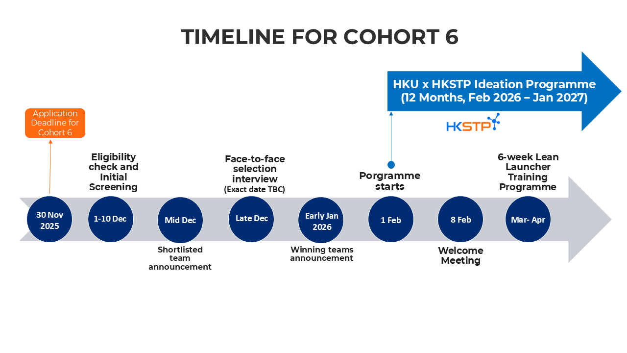 Mid Dec 2025 Shortlisted teams announcement 23 Dec 2025 (Tentatively) Shortlisted teams Pitching (Co-selection with HKSTP Ideation Programme) Early Jan 2026 Winning teams announcement -