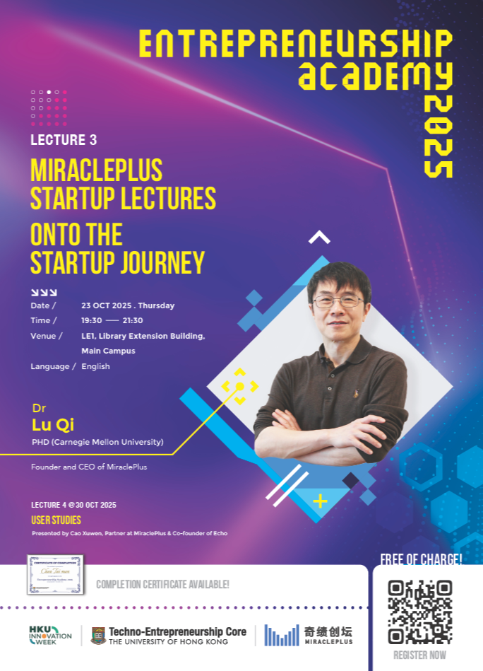 In this lecture, we are honoured to have Dr. Qi LU, Founder and CEO of MiraclePlus. This lecture will analyse the three main reasons why young people consider entrepreneurship. It will explain methodologies and share vivid case studies on finding startup opportunities and ideas, providing guidance and inspiration for those looking to start their own businesses.