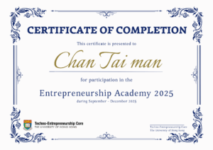 Entrepreneurship Academy is a non-degree programme offered by HKU Techno-Entrepreneurship Core. Participants who attend 7 or more physical sessions will receive certificates of attendance.