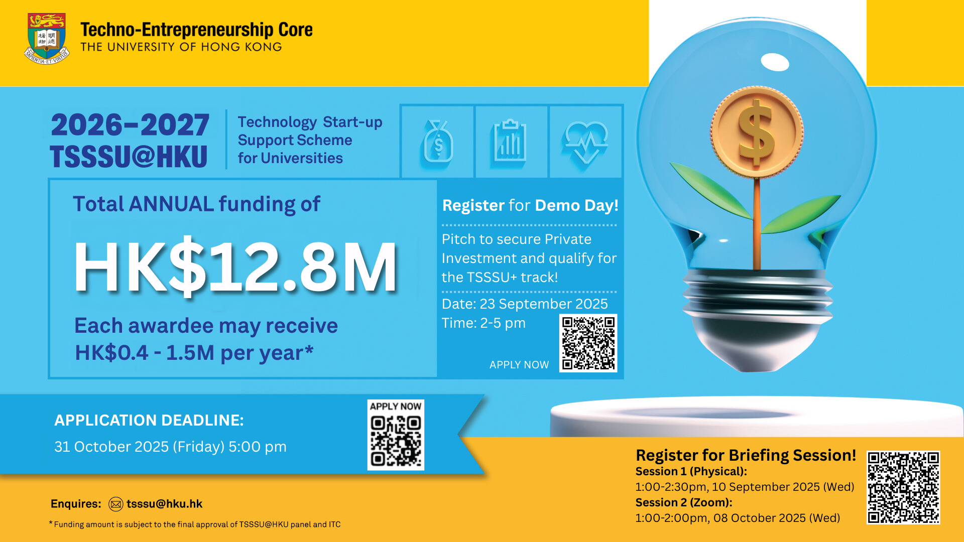 2026–27 TSSSU@HKU Briefing Session + TSSSU Awardee Sharing Date: 10 September 2025 (Wednesday) Time: 1:00 pm – 2:30 pm Venue: Innovation Wing 2, G/F Run Run Shaw Building 2026–27 TSSSU@HKU Briefing Session (repeat) Date: 8 October 2025 (Wednesday) Time: 1:00 pm – 2:00 pm Venue: Zoom Briefing Deck: Here