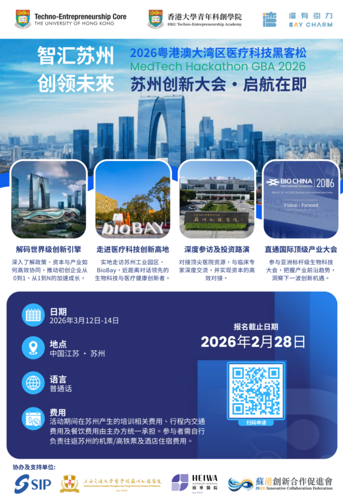 The MedTech Hackathon GBA 2026 empowers researchers to translate innovative ideas into market-ready solutions. Multidisciplinary teams will benefit from expert training, mentorship, and access to investors, funding, and corporate partners through the Lean Launcher Training Program. Participants will also take part in offsite industry visits to Suzhou and Guangzhou to network and explore collaboration opportunities. Selected teams will have the chance to pitch their solutions at Hong Kong’s premier healthcare event, the Asian Summit of Global Health (ASGH), on May 11–12, 2026, presenting to a targeted audience of industry leaders.